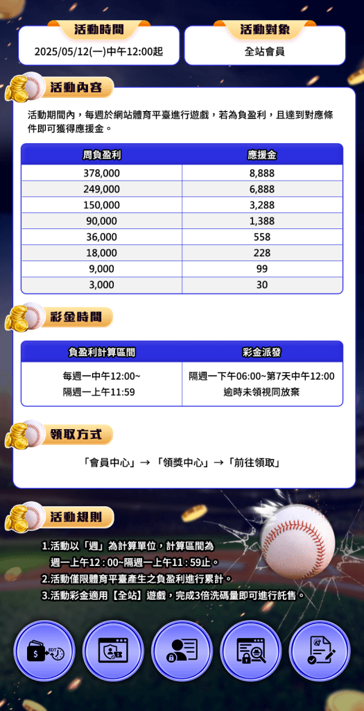 針對每日電子投注負盈利的玩家,全新推出《電子救援金方案》,只要你的虧損達到門檻,即可依照等級獲得對應的補助彩金,讓你不再為運氣差而氣餒,補血再戰不是夢!