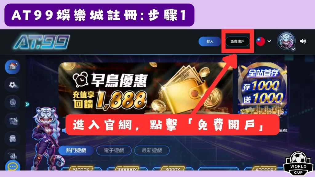 AT99娛樂城註冊第一步:點擊「免費開戶」進入官方平台